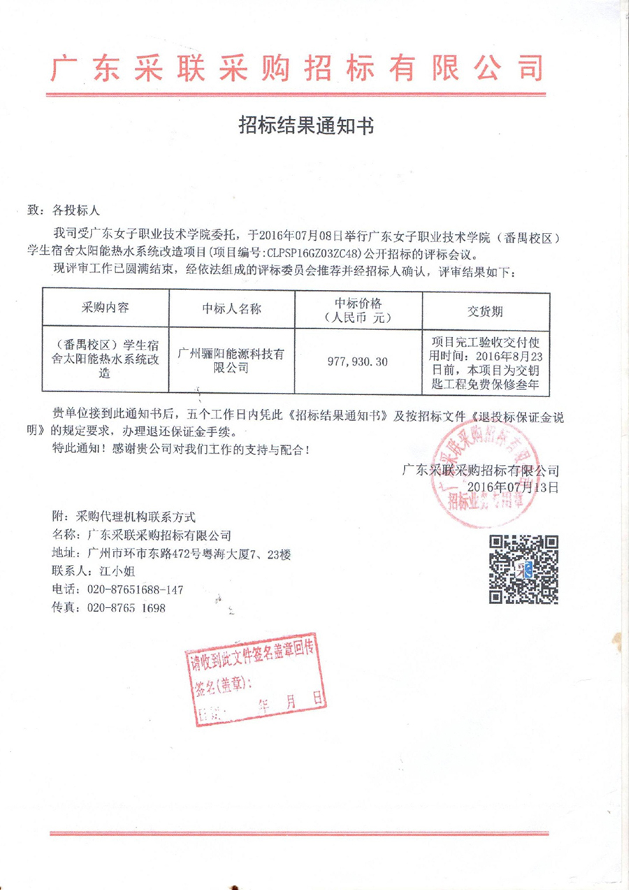 廣東女子職業(yè)技術(shù)學(xué)院學(xué)生宿舍太陽(yáng)能熱水系統(tǒng)改造項(xiàng)目
